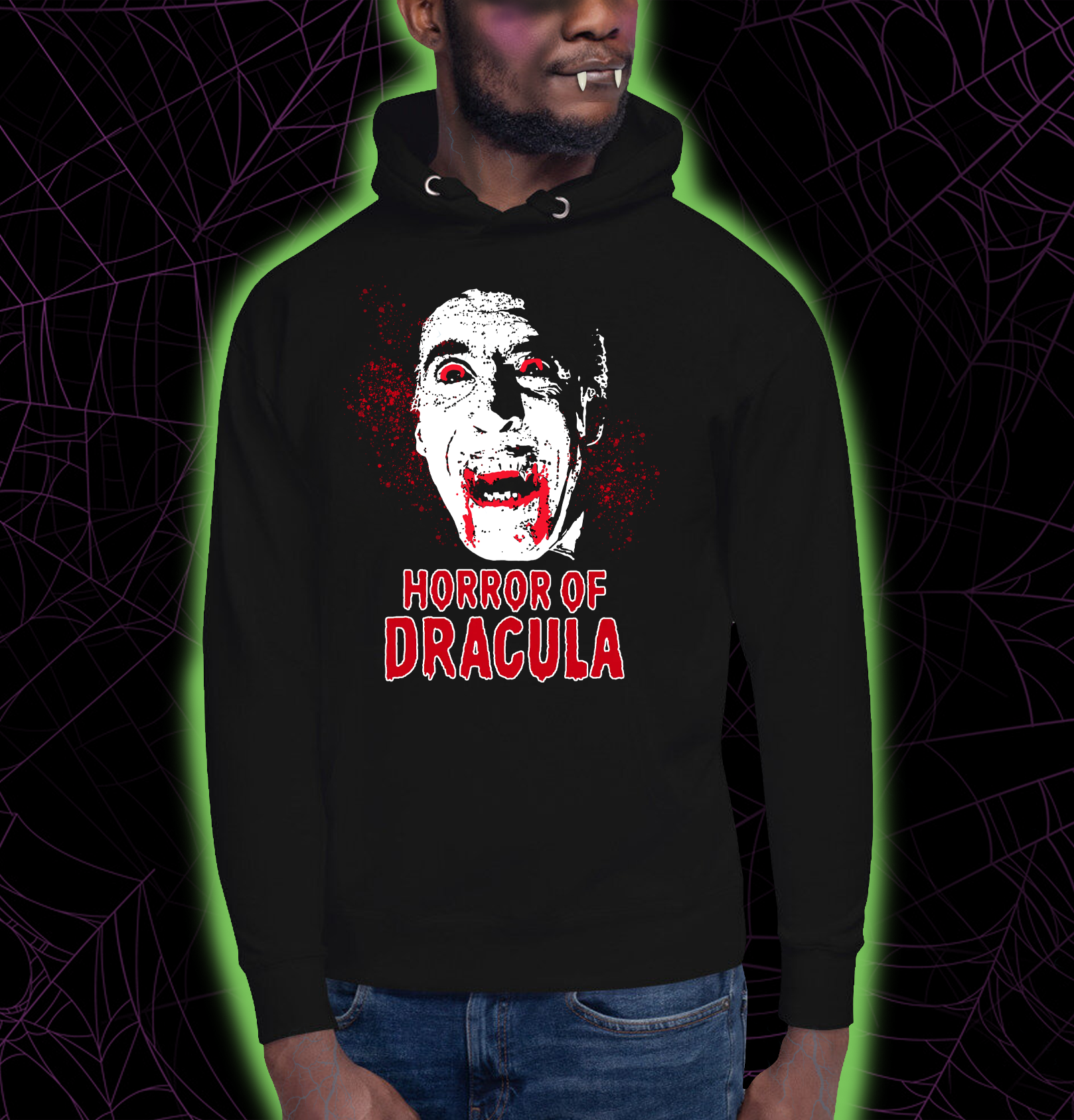 Oh, the horror! Now available our unisex Softstyle cotton hoodie. Here's your chance to dress the part of a Drac fan and show your love for everything undead! We throw in the blood spatter free-of-charge!